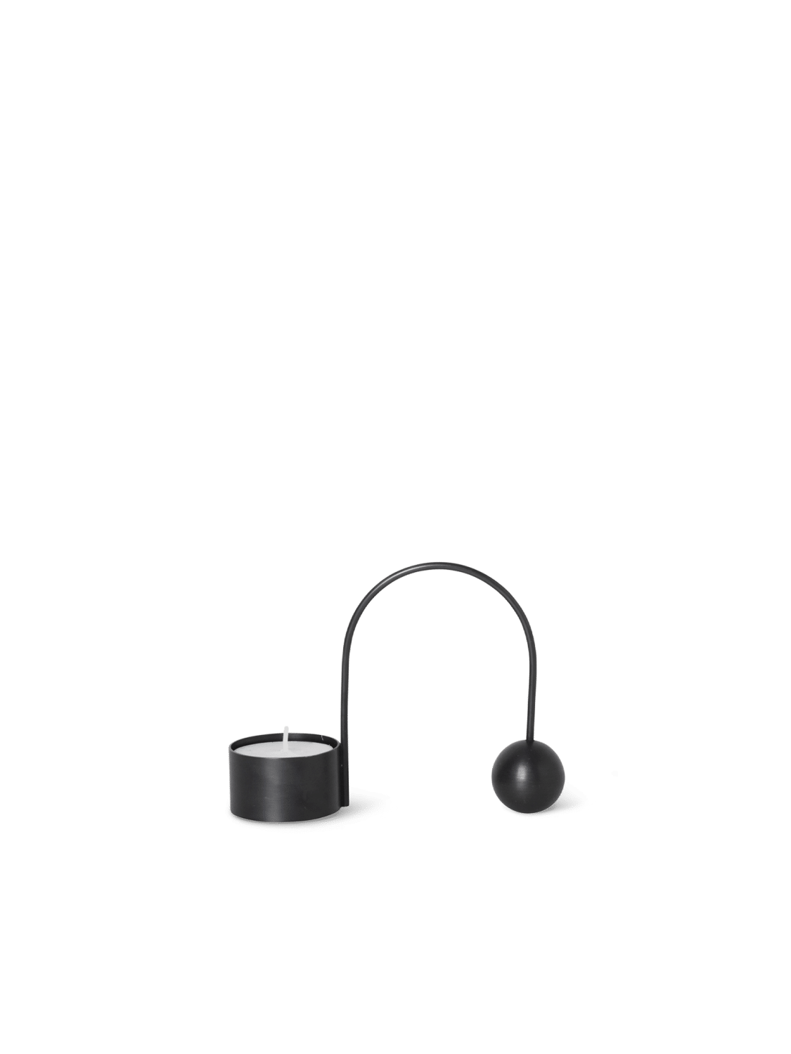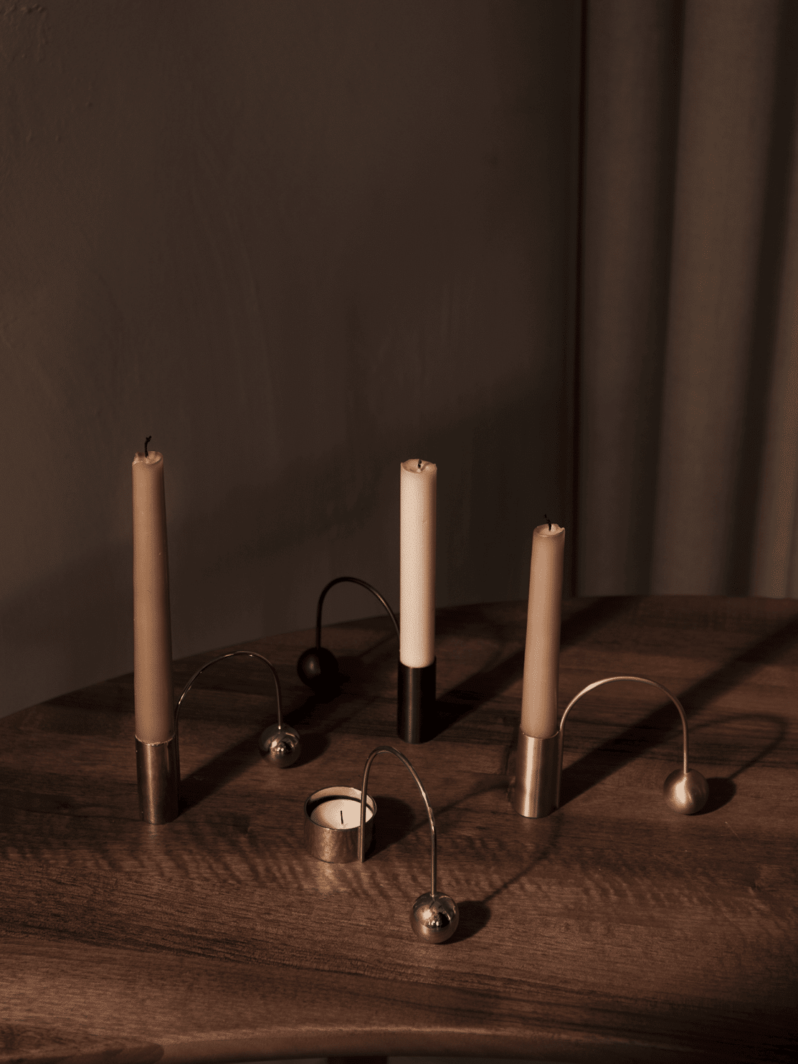 De geometriske formene er både skulpturelle og funksjonelle, da buen kan brukes som et håndtak for å bære lysestaken.