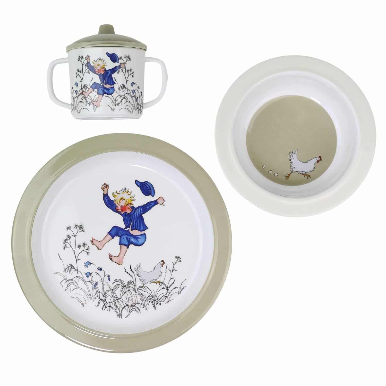 Barnesett i tre deler. Inneholder et tutkrus med to håndtak hvor lokket sitter godt fast ved hjelp av en silikonring. Det er en sølstopp i tuten som begrenser strømmen.år barnet blir større kan ventilen tas av. Settet har også en dyp og en flat plate med en silikonring under som gjør at de står stødig på bordet.