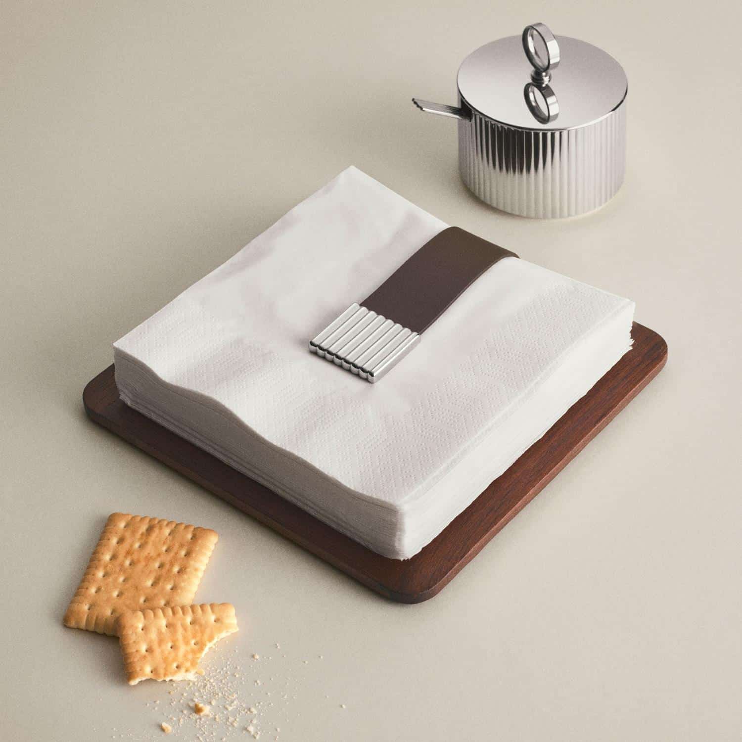 En spenne i blankt rustfritt stål holder serviettene fast på underlaget i røkt eik.