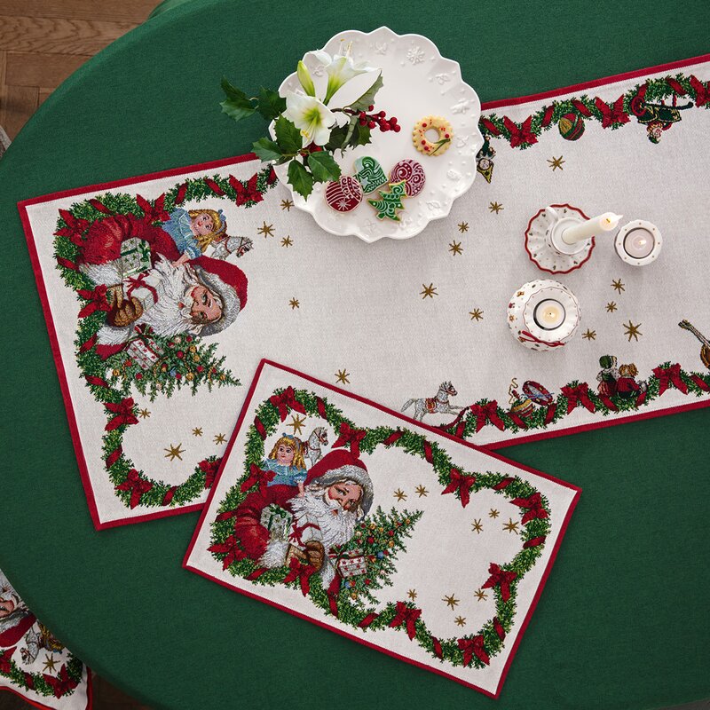 Toys Fantasy Gobelin juleløper XL santa 143×49 cm fra Villeroy & Boch er en stor og elegant juleløper som tilfører hjemmet ditt en festlig og varm atmosfære. Med sitt detaljerte julemotiv i rødt og grønt, fra den populære Toy’s Fantasy-kolleksjonen, er denne løperen perfekt for å dekorere både spisebordet, skjenken eller andre overflater du ønsker å gi et ekstra julepreg. Mønstrene og fargene kan enkelt kombineres med andre elementer fra samme kolleksjon, eller mikses med andre Villeroy & Boch-produkter for å skape en personlig og harmonisk juledekorasjon. Den store størrelsen gjør at løperen virkelig kommer til sin rett og blir et blikkfang i rommet.