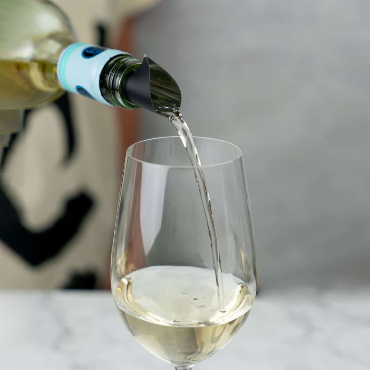En helletut til vinflasken, som gjør den enkel å helle uten søl. Sporene på hver side hindrer tuten i å skli ned i flasken.