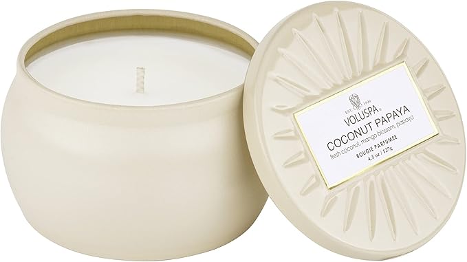 Voluspas unike kokosvoksblanding kommer i en metallbeholder på 115 g utsmykket med et vermeil-mønster, og har et matchende lokk som holder lyset støvfritt når det ikke er i bruk.