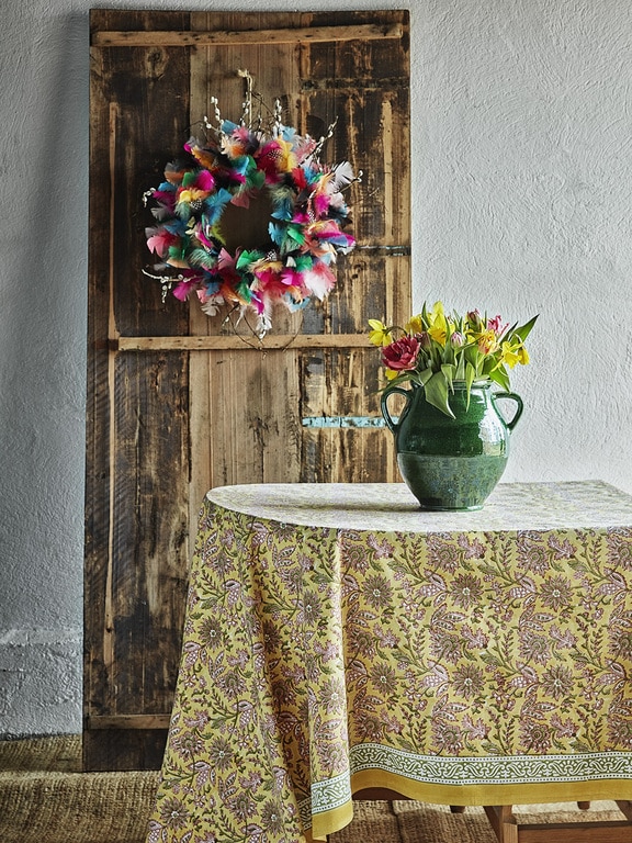 Duken er laget av slitesterk høykvalitets bomull og håndtrykt ved bruk av den eldgamle kunsten med treblokktrykk. Fullfør borddekkingen med matchende dekkebrikker og servietter.