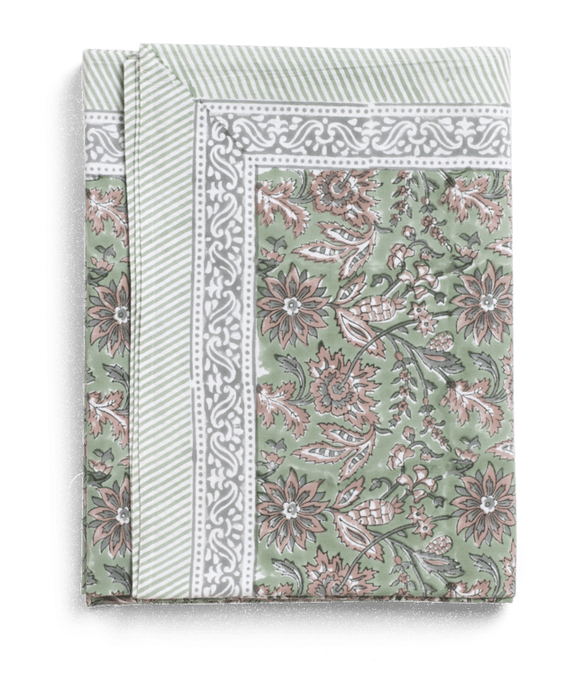 Vakker duk med blomstermønster i to farger og dekorativ border. Mønsteret er håndtrykt med tradisjonell indisk blokktrykkteknikk. Laget av høykvalitets bomullsstoff.