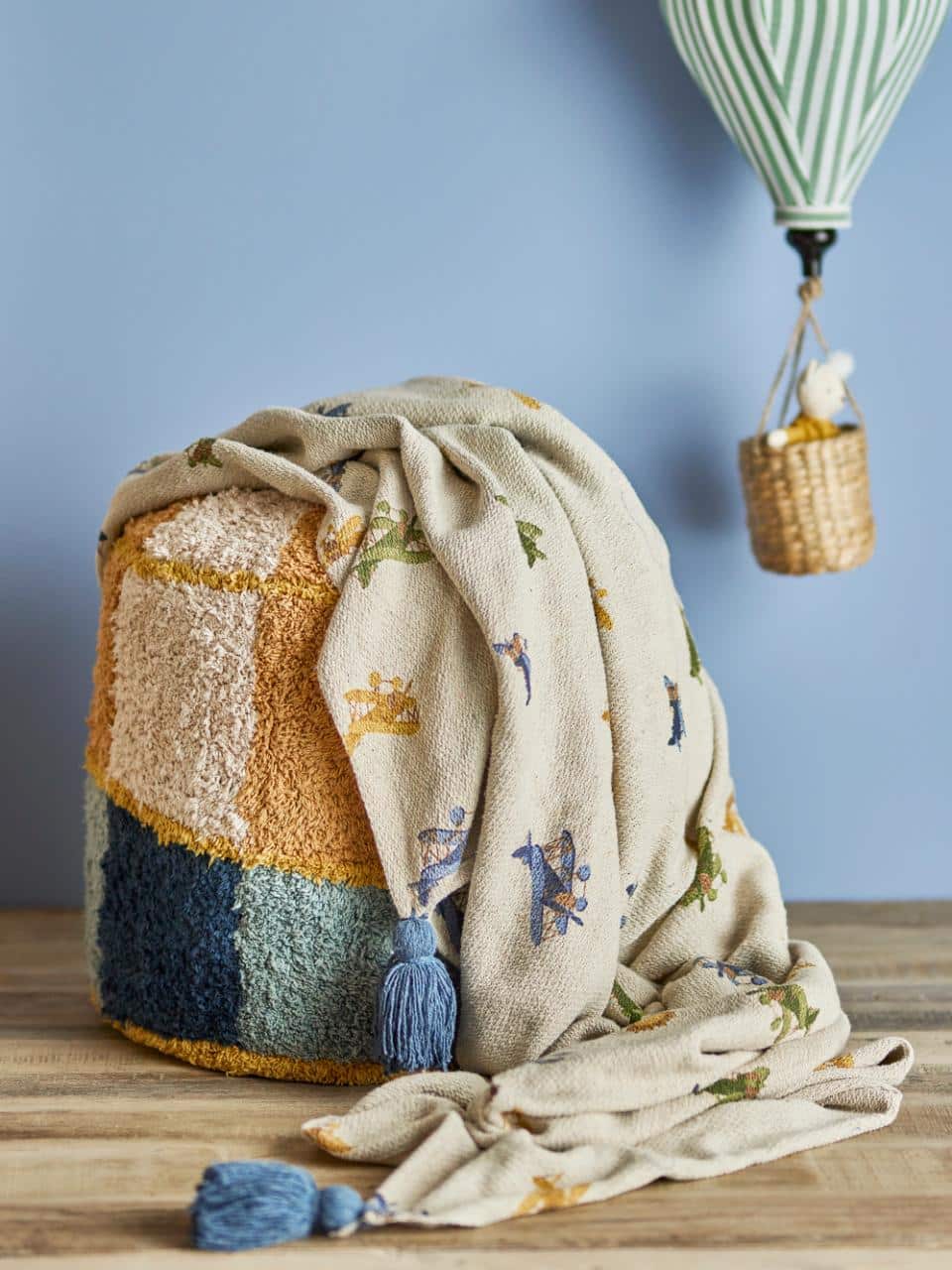 Flyteppet fra Bloomingville MINI er laget av resirkulert bomull, og med sine fine detaljer kan det spre glede og moro på barnerommet. Teppet er dekorert med søte motiver av fly og skyer, og i hvert hjørne er det blå dusker. Bruk teppet til å skape en koselig og varm atmosfære, eller legg det på gulvet når de små leker.