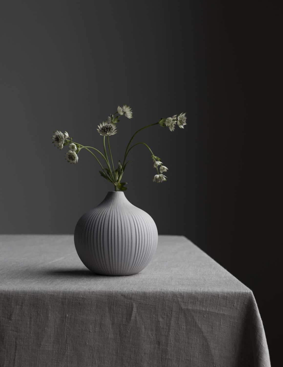 En nydelig grå vase, med riller.