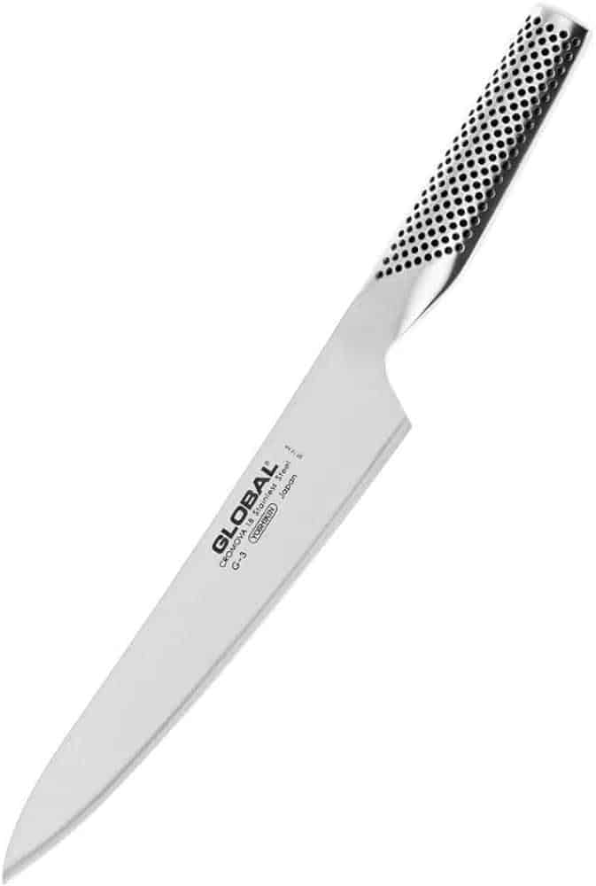 TIDLØS GLOBAL Den første Global G-2-kniven ble designet i Japan i 1985. Kokkekniven ser helt lik ut i dag som da den ble lansert for over 30 år siden,oe som er et bevis på at den har et virkelig godt design. Kniven er laget av Globals egen stålblanding Cromova 18. Kombinasjonen av slitesterkt stål, unikt design og en ekstremt skarp egg gjorde at interessen for Global-kniven vokste raskt. I begynnelsen var det profesjonelle kokker som brukte kniven, deretter fulgte hjemmekokkene etter. I dag er Global et svært populært knivmerke, både iorge og ute i verden. Alle med matlaglingsinteresse vetok at en skarp kniv er kokkens beste venn, men det som også er viktig, er at riktig kniv brukes til riktig råvare. I Globals klassiske serie finnes det en kniv for enhver anledning på kjøkkenet, alt fra kjøttøkser til fleksible filetkniver, grønnsakskniver og små skrellekniver. For å gi knivene en perfekt balanse i hånden, er skaftene fylt med havsand.