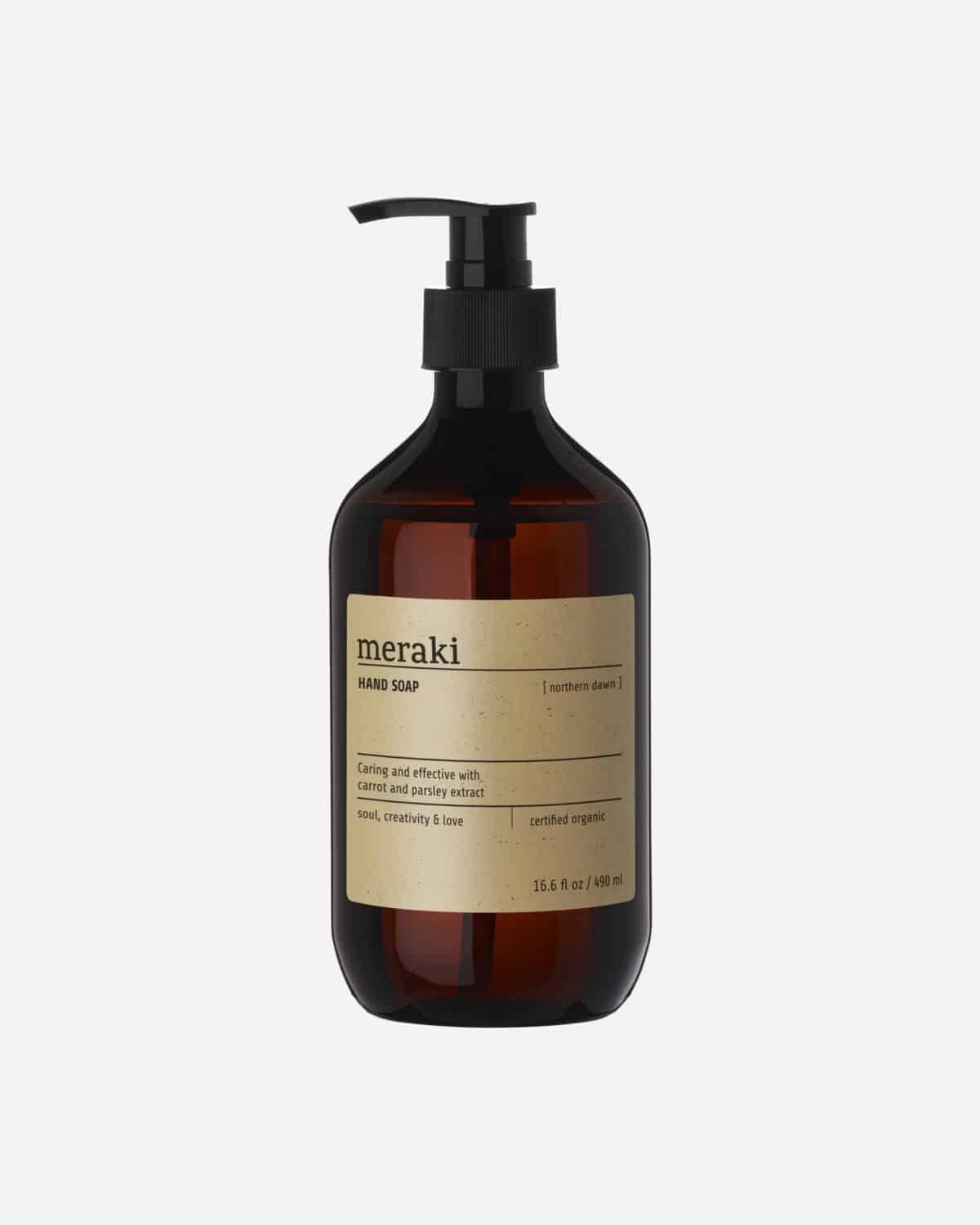 La håndsåpen bli et dekorativt element i innredningen på badet, på kjøkkenet eller på vaskerommet. Med Merakis økologisk sertifiserte håndsåpeorthern Dawn får du eærende og fuktighetsgivende såpe for hendene, som inneholder ekstrakt fra gulrot og persille og økologisk aloe vera. Såpen er velegnet til alle hudtyper, passer godt til daglig bruk og etterlater hendene velduftende. Pump ut en passende mengde såpe og skum hendene dine før du skyller grundig etter med vann.