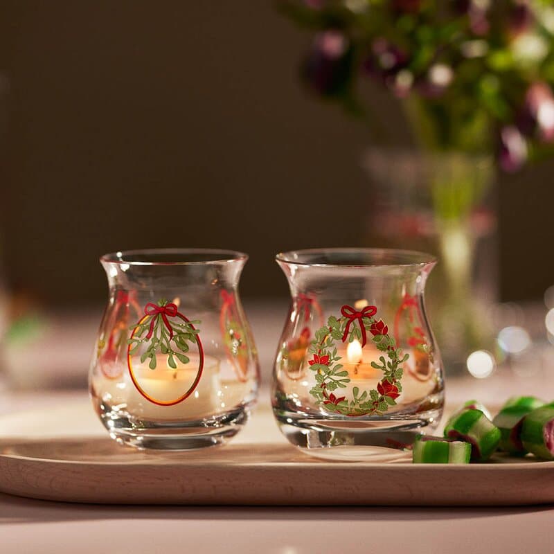 Hver lykt er 7,5 cm høy og 7 cm i diameter. De leveres som sett à to – perfekt for koselige stunder og varme julemåltider. En hyllest til Holmegaards 200 år med dansk glasskunst.