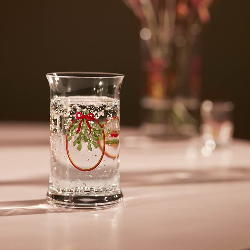 Med Holmegaards julevannglass 2025 får du både funksjon og følelse. Motivet tolket av Jette Frölich gjenspeiler julens vakreste symboler – juleroser, kristtorn, sløyfer og romantiske øyeblikk.