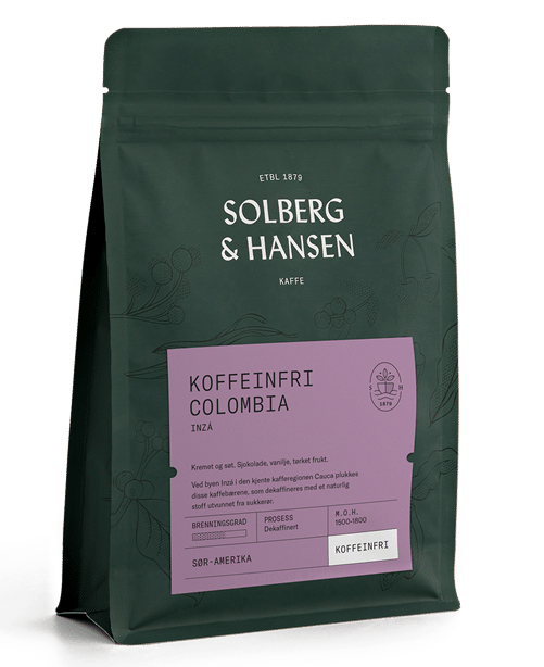 Ved byen Inzá i den kjente kafferegionen Cauca plukkes disse kaffebærene, som dekaffineres med et naturlig stoff utvunnet fra sukkerør.
