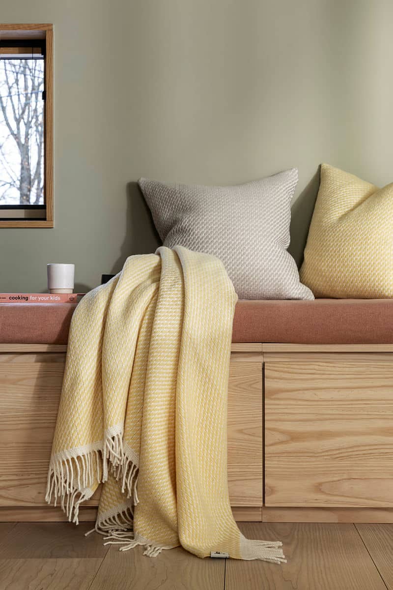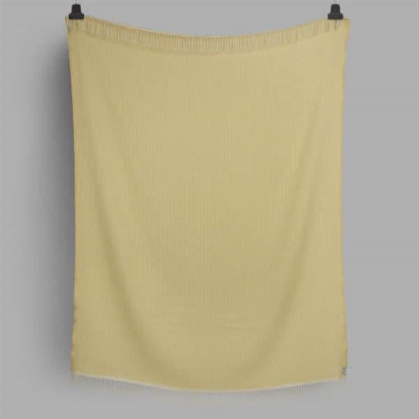 Denne fremgangsmetoden har resultert i en myk tredimensjonal tekstur. Frynsene gir et håndverksmessig preg på pleddet og en følelse av bevegelighet.