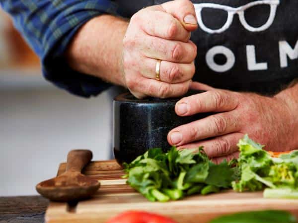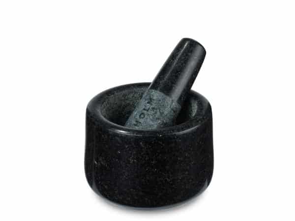 Morteren har en ytterside i polert granitt, en upolert innside og en matchende støter medfølger.