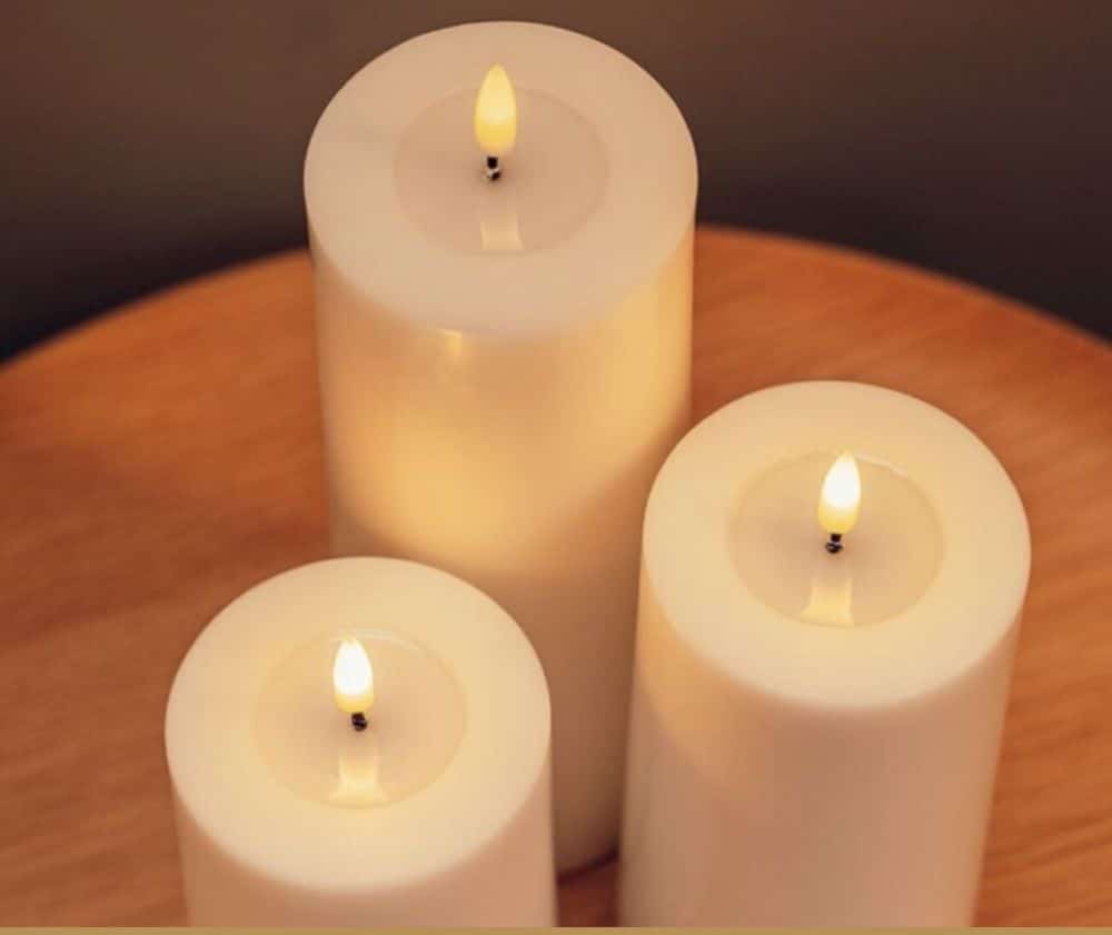 Kubbelysene er laget av 100% ekte stearin med en harpiks ring på toppen som får det til å se ut som om det er flytende voks øverst på lyset og som flammen speiler seg i – veldig vakre og naturtro.