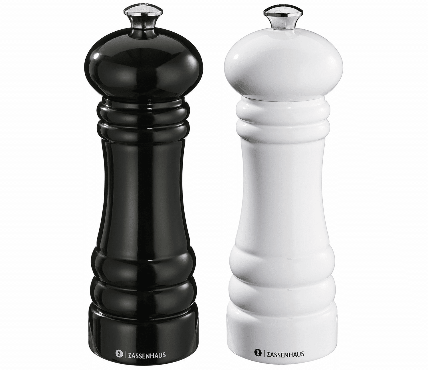 Sett med hvit saltkvern og svart pepperkvern i Zassenhaus’ mest populære serie Berlin, med Zassenhaus’ nesten uslitelige keramiske kvernverk.