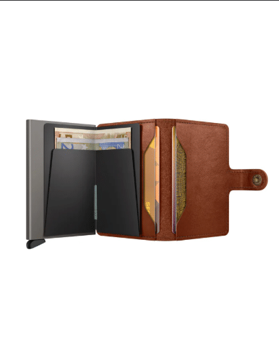 Liten i størrelse og overraskende stor i lagringskapasitet, Miniwallet kombinerer det beste fra begge verdener. Eksteriøret rommer sedler, kvittering og kort, mens Cardprotector i aluminium lar deg skyve ut kort med en enkel bevegelse og beskytter dem mot bøyning, brudd og uønsket trådløs kommunikasjon.