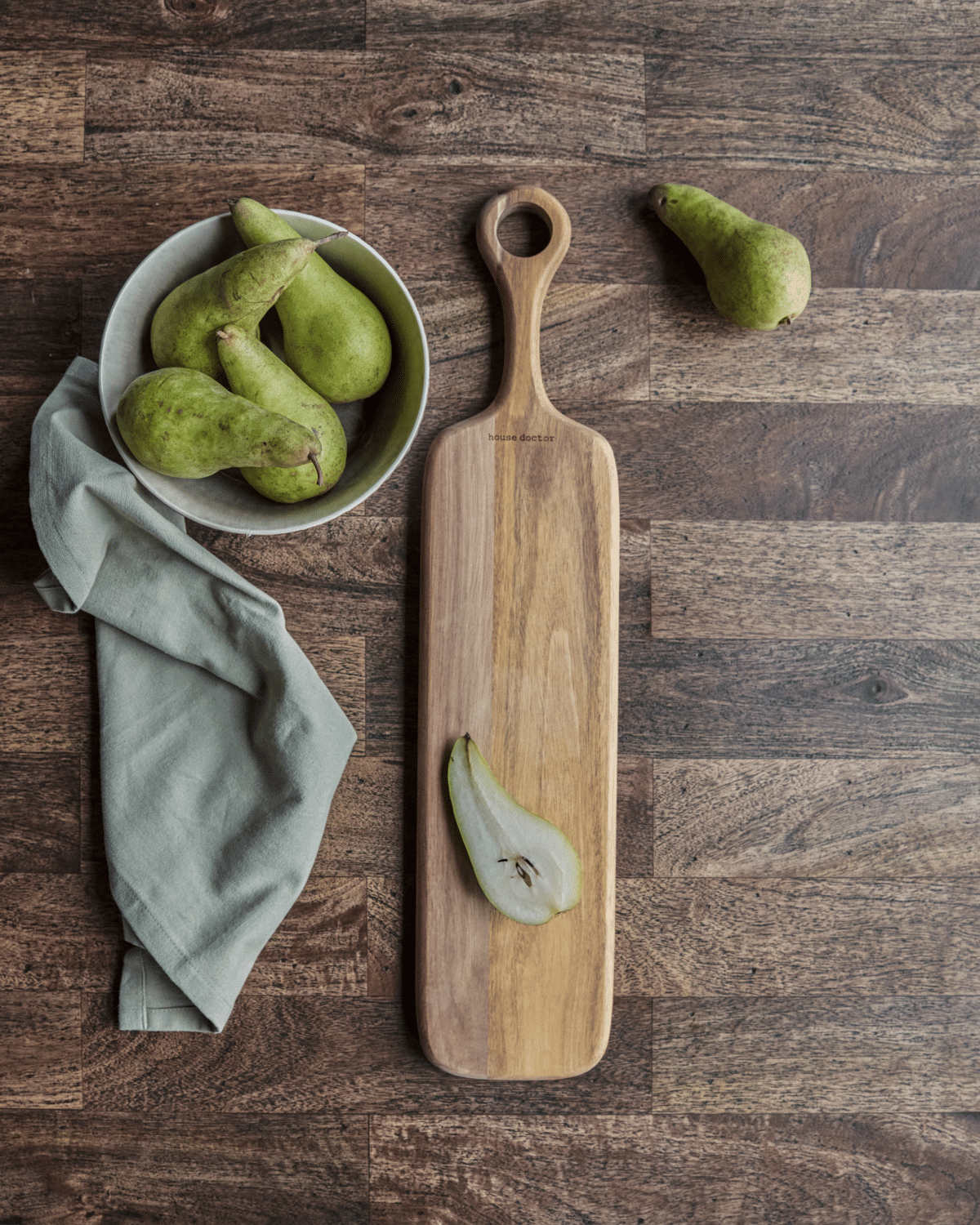 Dette lange skjærebrettet fra House Doctor er en nødvendighet i hverdagen. Fremstilt i akasietre gir skjærebrettet kjøkkenet et varmt og delikat preg. Lengden og håndtaket gjør det også ideelt som serveringsfat for tapas eller snacks når du har gjester på besøk. Eller du kan bruke det til å skjære brød på . Når skjærebrettet ikke er i bruk, kan du la det stå opp til veggen som en del av kjøkkeninnredningen.