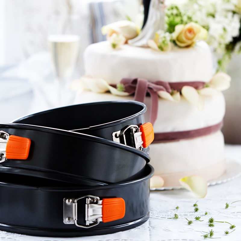 Le Creuset springform er egnet til mange formål, inkludert baking av paier, brød og kaker. Ringen løsnes fra bunnen av formen slik at den ferdige deigen kan legges på et serveringsfat med form og struktur intakt. Takket være den glatte overflaten trenger ikke formen å smøres, og deigen kommer også lett av når den er ferdig stekt. Formens effektive og jevne varmefordeling hindrer at maten brenner seg. Alle Le Creuset stekeplater og -former har varmebestandige og sklisikre silikonhåndtak som gjør dem enkle å jobbe med.