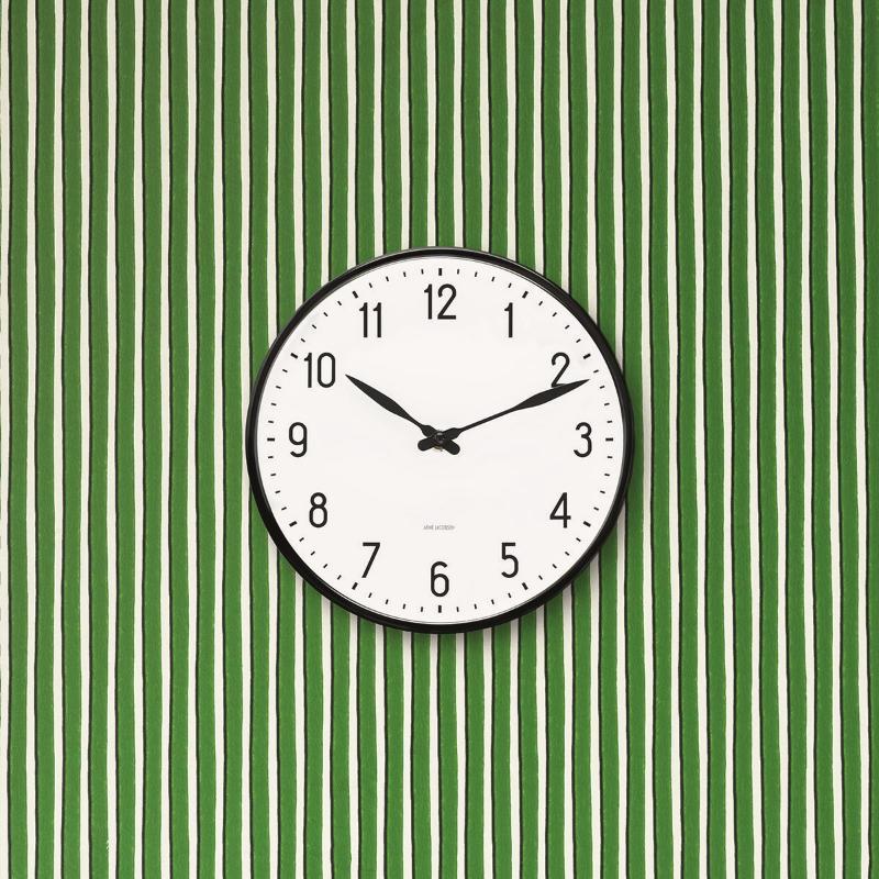 Få kontroll over tiden og sjekk tidens innredningstendenser. Arne Jacobsens Station-klokke ble opprinnelig tegnet til el-vare-produsenten LK i 1941. Originaldesignen for den ikoniske klassikeren er nå gjenskapt og forvandler en anonym hvit vegg til et markant designstatement. Den grafiske designet understrekes av en toppring i sort aluminium. Finnes i tre størrelser, her i mellomstort format. En god gaveide som vil gå i arv i generasjoner.