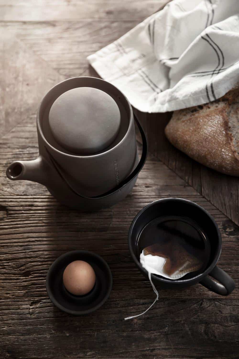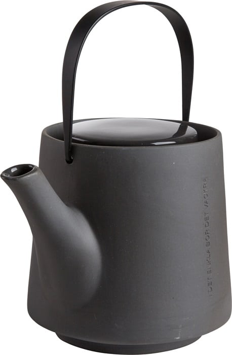ERNST tekanne i steintøy er tilgjengelig i hvitt og mørkegrått med et svart metallhåndtak.