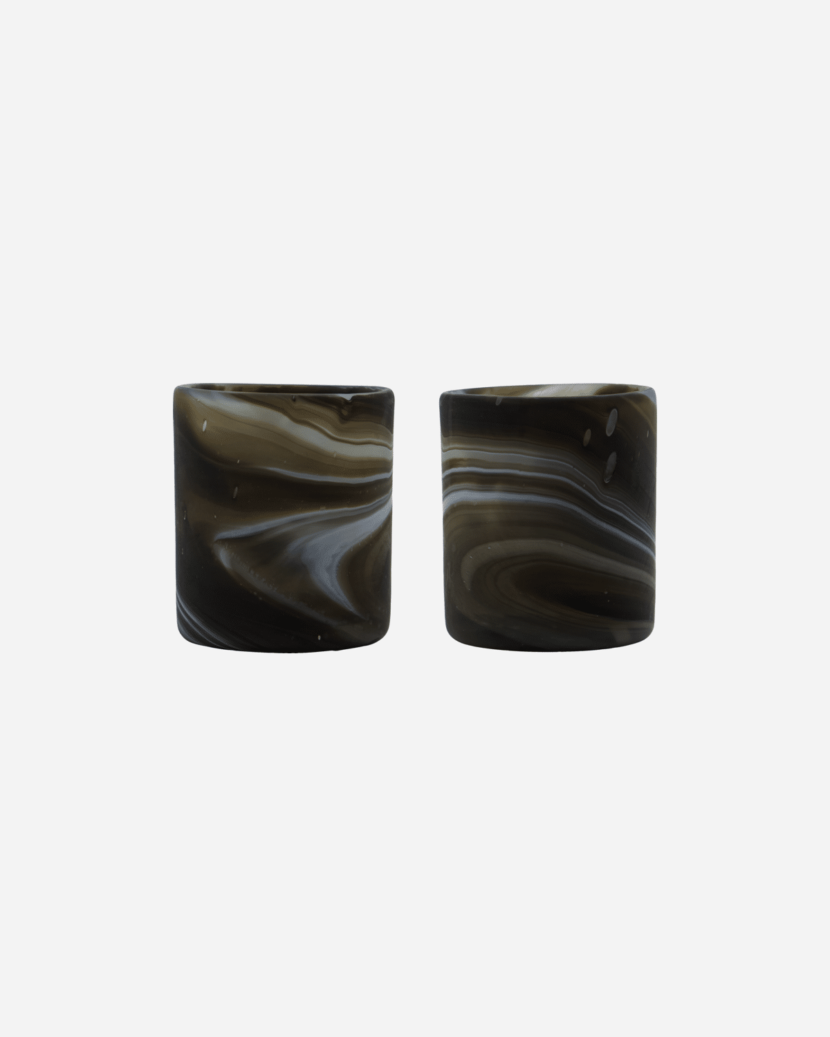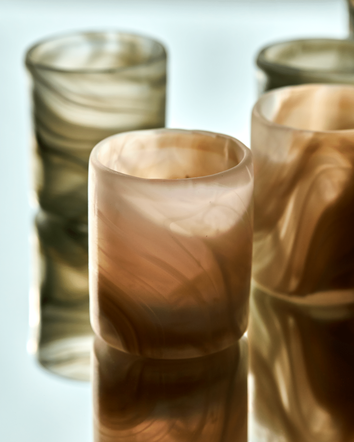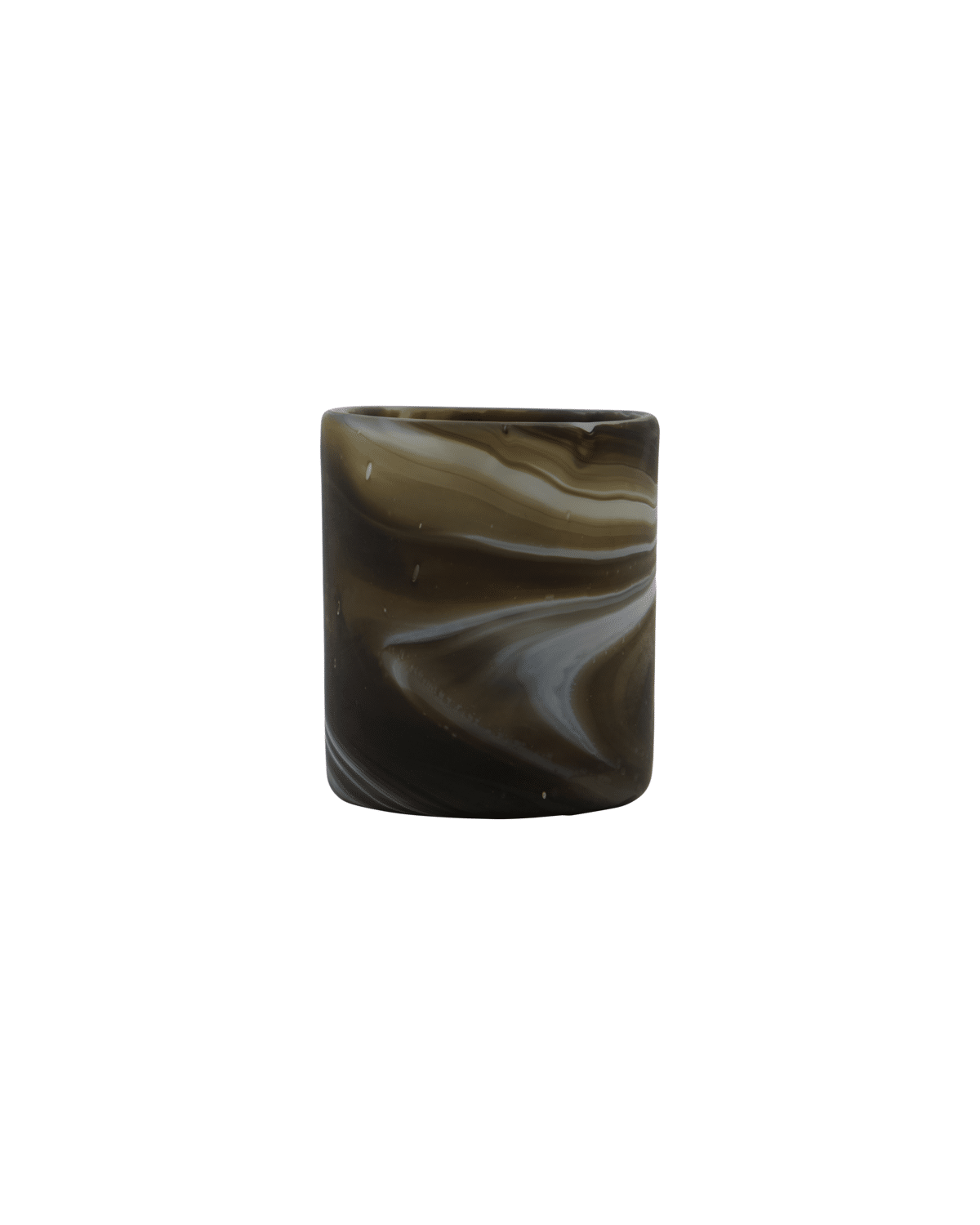 Gi stuen, spisebordet eller badet et løft med denne telysholder i munnblåst brunt glass. Marmorerte detaljer gjør hver holder unik og gir et elegant og varmt uttrykk.