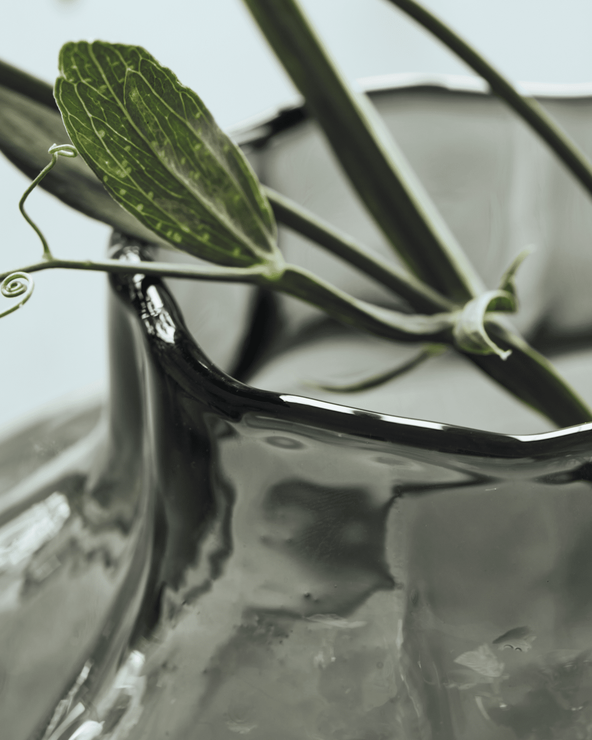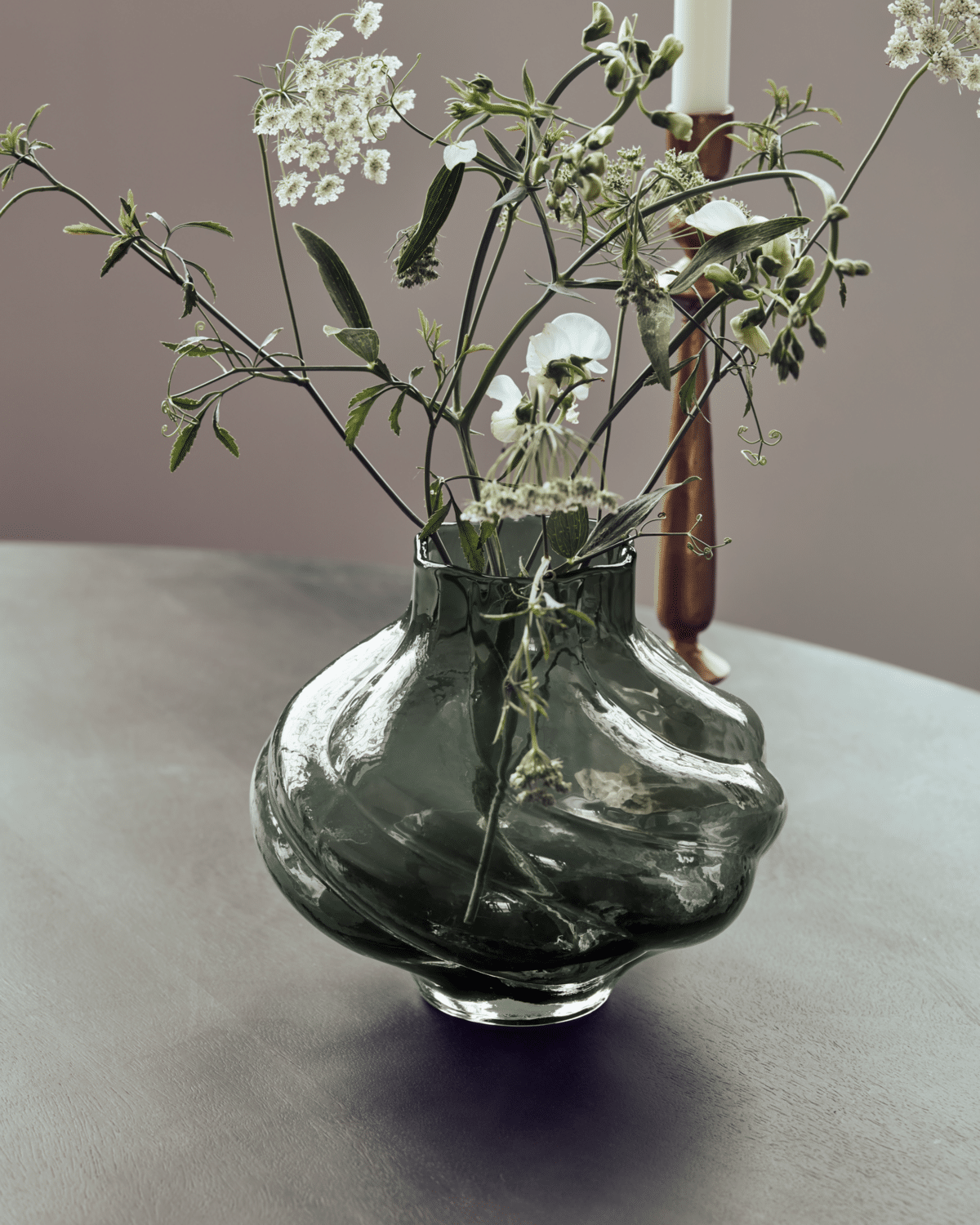 Legg et unikt preg på hjemmet ditt med denne håndlagde vasen i mundblæst glas. Den røykgrå fargen og de snoede linjene gir en dynamisk og elegant utstråling. Perfekt som et lite kunstobjekt eller fylt med blomster for å skape et iøynefallende midtpunkt.